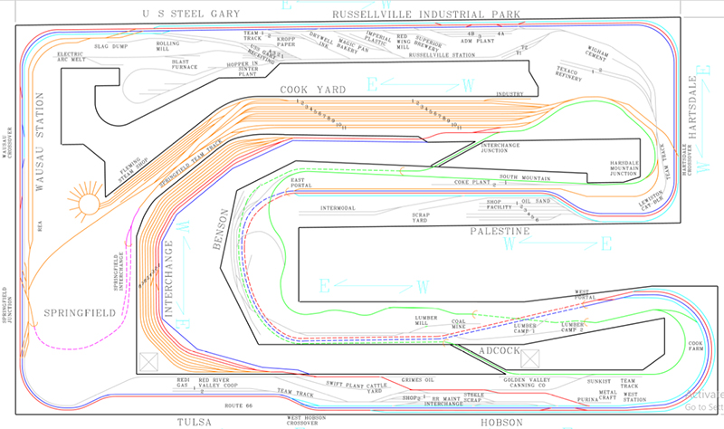 HO Scale Club LayoutThe current club HO scale layout covers an area of 3,000 square feet. There are two independent main line tracks, each 246 feet long with 28” minimum radius curves. At scale speed a train takes almost four minutes to complete the loop. We've recently completed a large staging yard that has greatly enhanced our weekly operating sessions! We've also enhanced the scenery along the Tulsa and Hobson areas with extensive building renovations, lighting upgrades, and numerous scenic vignettes added for spectator interest. Each of the four track systems may be selected for DC or DCC power. You can run a vintage DC engine on one track while running a modern sound decoder equipped DCC engine on another track. The DC and DCC systems both utilize wireless throttles. Additionally, we offer wireless connectivity through JMRI to operate your DCC equipped trains using a Wi-Fi enabled tablet or smart phone. In order to properly configure multiple DCC decoder equipped engines we have a JMRI speed matching table for members' use. |